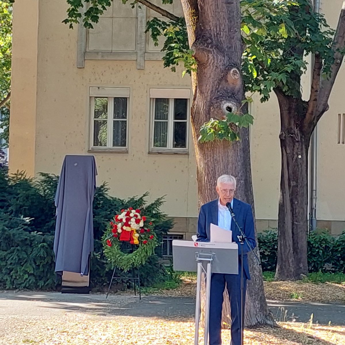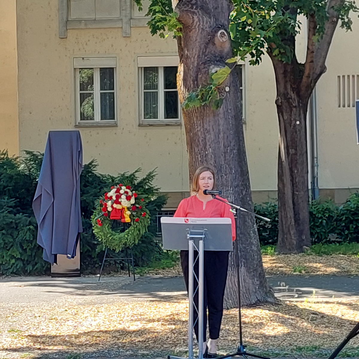 Bei der Enthüllung sprachen Oberbürgermeister Michael Ebling, Landtagspräsident Hendrik Hering, Familienstaatsministerin Katharina Binz sowie Joachim Schulte, Sprecher von Queernet Rheinland-Pfalz. Dabei machten sie alle deutlich, dass diese neue Gedenkstelle Ort der Erinnerung und Mahnung zugleich ist. Katharina Binz: „Die Gedenkstele ist damit zugleich Erinnerung an die Opfer staatlichen Handelns aber auch Mahnung an den Staat. Die Universalität der Menschenrechte für lesbische, schwule, bisexuelle, transidente, intergeschlechtliche und nichtbinäre Menschen darf in Deutschland nie wieder in Frage stehen.“ Zugleich verwiesen alle Redner*innen auf die Verstöße gegen die Menschenrechte und die fortdauernde Ausgrenzung und Verfolgung von LSBTIQ-Personen in europäischen Nachbarstaaten wie Polen oder Ungarn. Nun wurde die neue Gedenkstele auf dem Ernst-Ludwig-Platz gemeinsam enthüllt. Gerade dieser gewählte Ort – vor den Gebäuden des Land- und Amtsgerichtes – steht für das Weiterwirken des § 175 in der Bundesrepublik sowie die Beteiligung der Justiz über die Strafgerichtsbarkeit mit erfolgten Verurteilungen nach § 175 StGB.