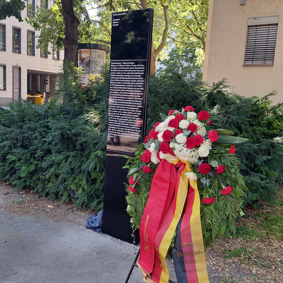Gestern, am 21. Juli 2021, wurde auf dem Ernst-Ludwig-Platz in Mainz eine neue Stele zum Gedenken an die Verfolgung von Menschen aufgrund ihrer geschlechtlichen Identität und/oder sexuellen Orientierung in der Zeit des Nationalsozialismus und der Nachkriegszeit enthüllt.