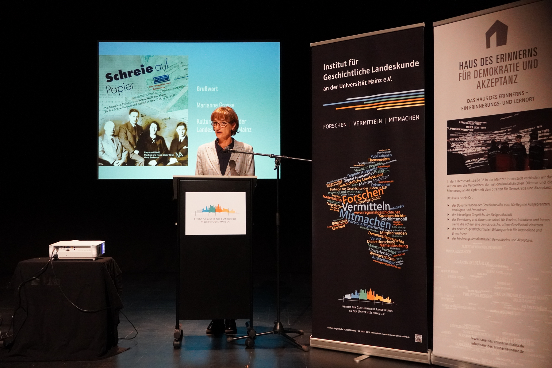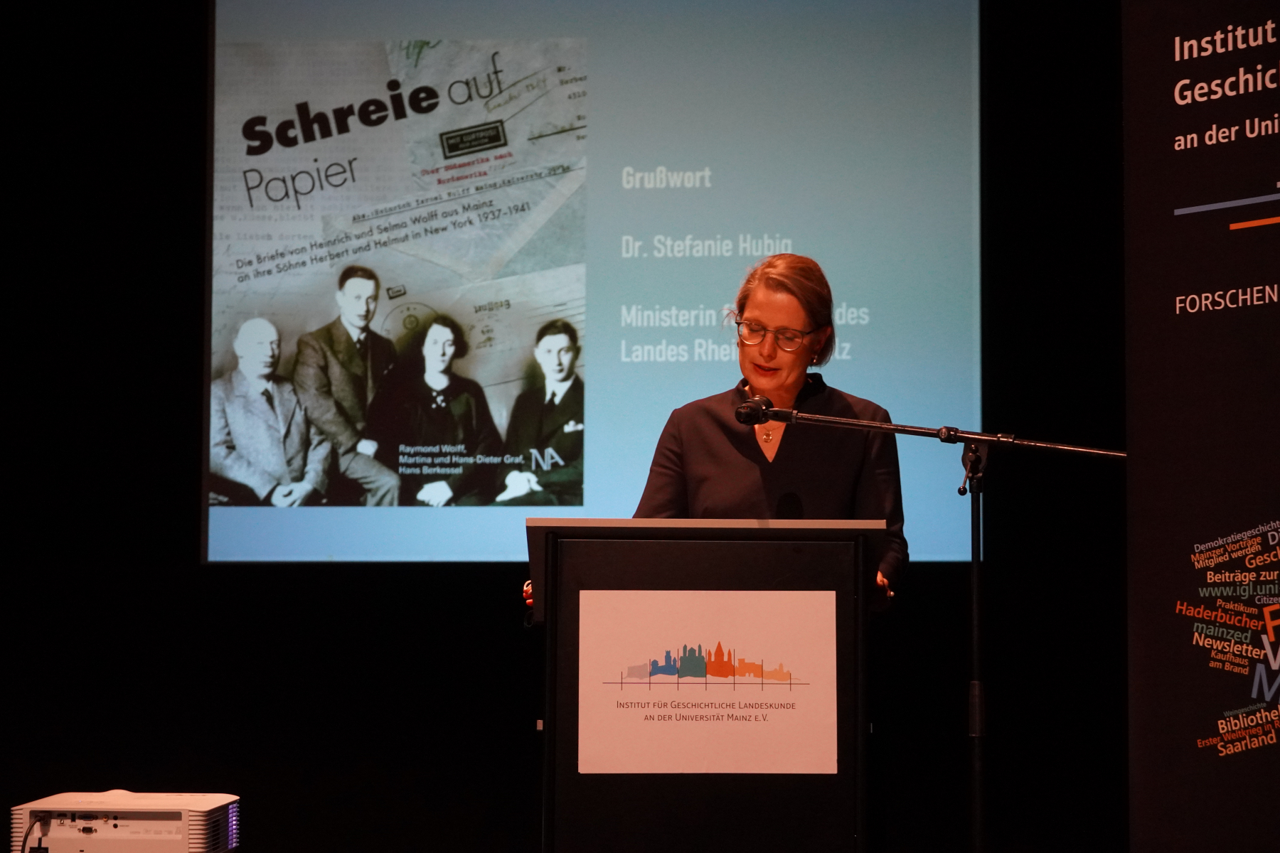 Die besondere Aktualität der Beschäftigung mit Krieg und Unterdrückung hob die rheinland-pfälzische Ministerin für Bildung, Dr. Stefanie Hubig, mit Blick auf die Ukraine hervor. Sie betonte daran anschließend die besondere historische Verantwortung Deutschlands, weiterhin gegen das Vergessen der NS-Diktatur und des Holocausts vorzugehen. Insbesondere für die jüngere Generation sei es dabei hilfreich, regionale Verbindungen und emotionale Nähe herzustellen, wie es in „Schreie auf Papier“ geschehe. Als Beispiel hob sie die Arbeit der Schüler*innen der Klasse 10c des Rabanus-Maurus-Gymnasiums in Mainz hervor, die basierend auf der Publikation eine Wandzeitung erstellt haben, in der sie ihre Auseinandersetzung mit den Briefen und der Familienbiografie dokumentierten. „Das Schicksal der Nackenheimer Familie Wolff“, so die Ministerin, „verdeutlicht beispielhaft die Auswirkungen der NS-Politik auf die Lebensverhältnisse der jüdischen Deutschen, die in Rheinhessen ihre angestammte Heimat, ihren Wirkungs- und Freundeskreis hatten.“