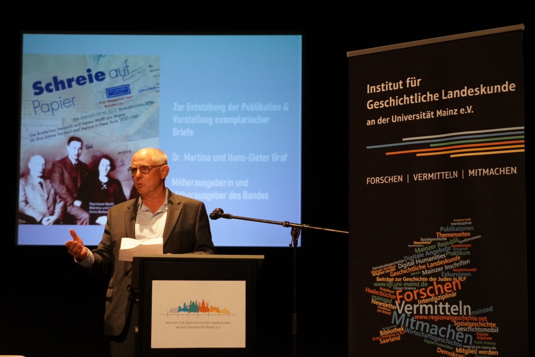 Professor Dr. Michael Matheus, Vorsitzender und Direktor des Instituts für Geschichtliche Landeskunde an der Universität Mainz e.V. (IGL), wies in seiner Begrüßung und Einführung zunächst daraufhin, dass Studien zur jüdischen Geschichte in der wissenschaftlichen Arbeit des IGL immer wieder eine wichtige Rolle spielten und unverändert spielen. So erschien im Jahr 2016 mit dem Band „Leuchte des Exils. Zeugnisse jüdischen Lebens in Mainz und Bingen“ die erste Publikation in der neuen Reihe des IGL: „Beiträge zur Geschichte der Juden in Rheinland-Pfalz“. Das Herzstück der Reihe stellen drei Bände dar, in denen Quellen und Abbildungen zur jüdischen Geschichte der sogen. SchUM-Städte Speyer, Worms, Mainz veröffentlicht werden. Mit Blick auf den jetzt vorliegenden vierten Band der die Seltenheit der umfassend erhaltenen Briefe hervor und nannte sie einen „Überlieferungs-Glücksfall“: „Der Briefwechsel aus Mainz nach New York ist einseitig fast vollständig erhalten, ein Überlieferungszufall. Zudem waren Mitglieder der Familie bereit, ihn für diese Edition zur Verfügung zu stellen. Zum dritten fanden sich Spezialisten, die eine wissenschaftliche Edition auf die Beine gestellt, und das heißt nicht zuletzt eine historische Einordnung geleistet haben. Dies ist Voraussetzung für eine wissenschaftlicher Quellenkritik verpflichteter historische Erinnerungsarbeit, der wir am IGL einen hohen Stellenwert zuweisen.“ Direkte personale Quellen und Zeugnisse hätten erinnerungskulturell zudem eine zunehmend große Bedeutung, da die Zahl der Zeitzeug*innen immer geringer werde.