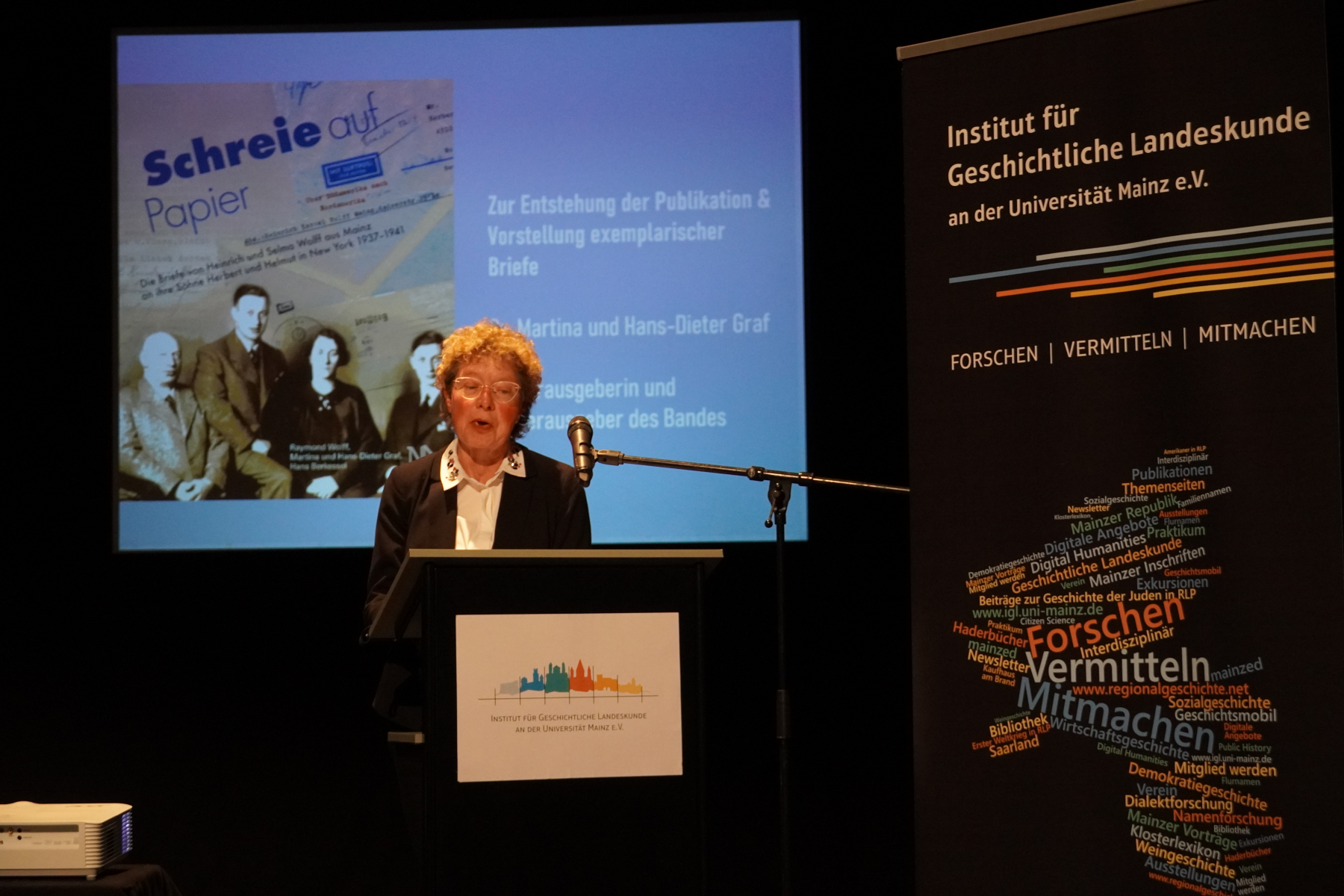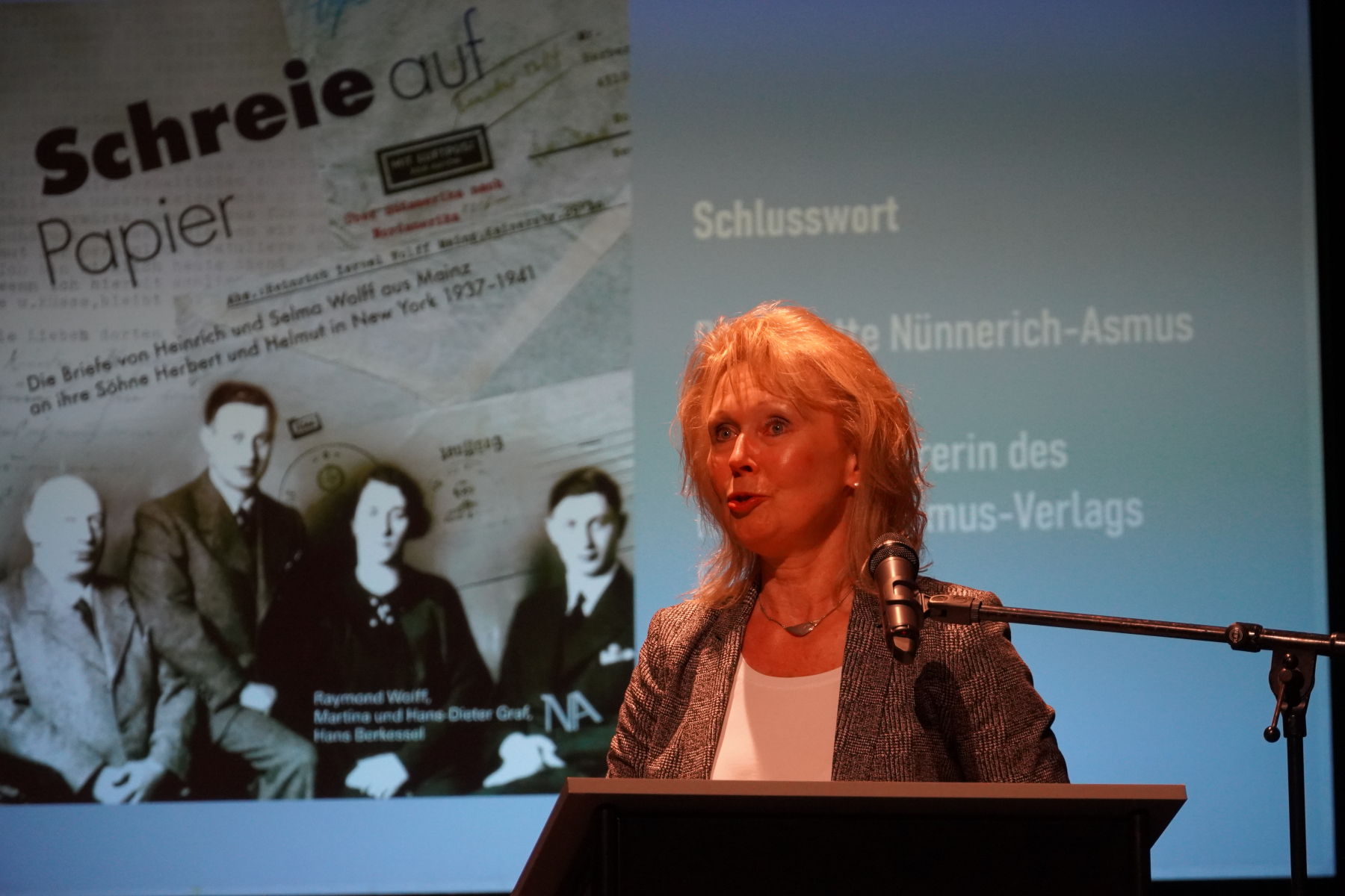 Auch Marianne Grosse, Kulturdezernentin der Stadt Mainz, betonte in ihrem Grußwort die Bedeutung regionaler Erinnerungskultur: „Diese Briefe sind von unschätzbarem historischem Wert für unsere Stadt!“ Das Buch sei eine Mahnung für die heutige Zeit, aktiv an einer toleranten Gesellschaft mitzuwirken. Daran knüpften auch andere Einrichtungen und Gedenkorte an, so etwa das künftig entstehende Mahnmal am ehemaligen Mainzer Güterbahnhof, von dem aus die Mainzer Jüdinnen und Juden im März und September 1942 deportiert wurden – darunter auch das Ehepaar Wolff.